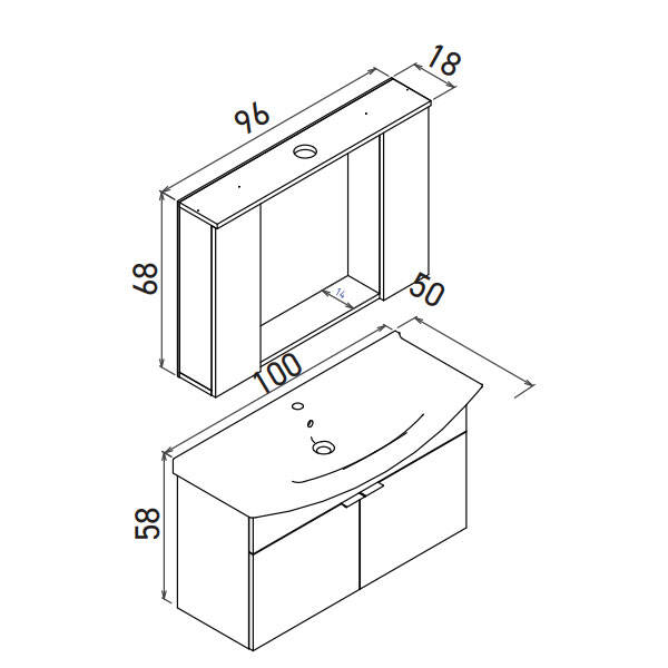 • Ayna dolaplı, düz aynalı ve etajerli, led spotlu, kutu dolaplı üst modül alternatifleri